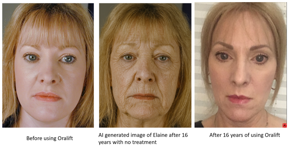 Before and after Oralift results: Elaine looks visibly younger after 16 years compared to AI-projected natural aging.